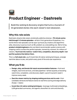 Build the ranking & discovery engine that turns a tsunami of AI‑generated stories into each viewer’s next obsession. Dashreels streams bite‑sized, emotionally addictive dramas—70‑minute series told through 1–2 minute episodes—all born from generative‑AI pipelines. In a world where new episodes can be spun up hourly by creators and algorithms alike, discovery is just as much an ML problem as a storytelling one. We’re hiring product‑minded engineers who can blend recommender‑system science with shipping craft to surface the perfect episode, moment by moment, for millions of viewers. You’ll own the metrics—watch‑time, completion, discovery depth—not just the systems that deliver them. This is a full‑stack role: you’ll invent Gen‑AI‑native ranking techniques, wrangle real‑time data at scale, and polish every pixel of the end‑user experience.