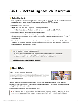 Join the core engineering team at SARAL, a company dedicated to building the world's best influencer operating system that powers partnerships between e-commerce brands and creators. This is a completely remote role within a lean team of 15, including 4 engineers.